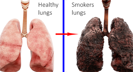 The pink, healthy lungs (left) transform into ugly grey and scarred lungs of a 10 yr smoker (Right). Smoking is proven to cause fatal cancers.
